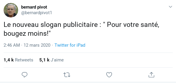 Le second élément que je constate, c’est que la pause imposée par les différents gouvernements s’applique au sens large. D’abord, beaucoup prennent le temps de marcher, de passer du temps en famille, de lire, de ressortir les jeux de société, de réapprendre à cuisiner, bref, de vivre.
