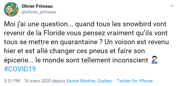Je constate personnellement deux chambardements majeurs. Le premier, c’est qu’une égalité sociale vient de s’établir. Peu importe son statut, tout le monde vit cette situation de la même façon. La chanteuse Madonna l’explique plutôt bien dans cette vidéo, diffusée dimanche dernier. Et la réaction négative de certains puissants de ce monde, dont au moins un a ouvertement réclamé des sacrifices humains pour épargner l’économie de son pays, confirme cet état de fait. Leur peur est palpable.
