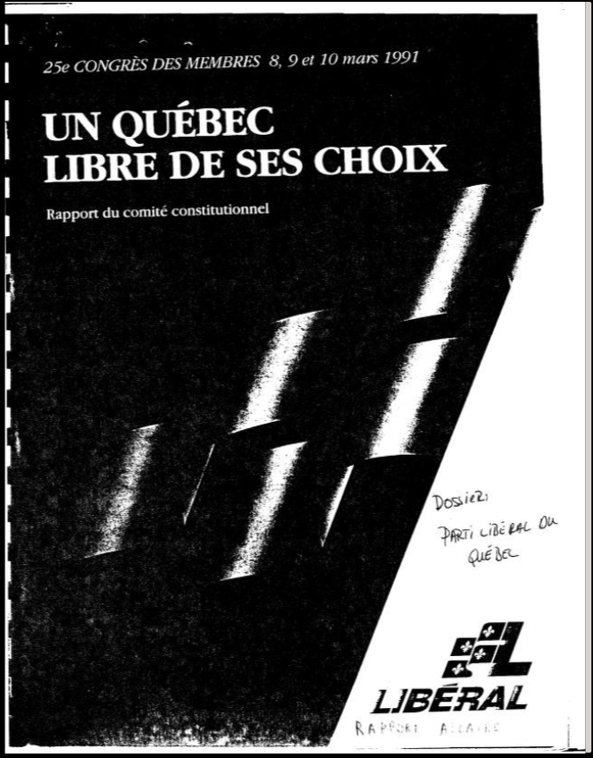 Remarquez-vous le discret triangle rouge, au haut de la page frontispice ? Le jupon dépasse, comme dirait l’autre ! Un Québec libre de ses choix était également le titre du rapport du comité constitutionnel du Parti libéral du Québec, publié en 1991. Pour celles et ceux qui s’en souviennent, c’est le document qu’on a longtemps et communément appelé le rapport Allaire, en référence à celui qui présidait ce comité, Jean Allaire.