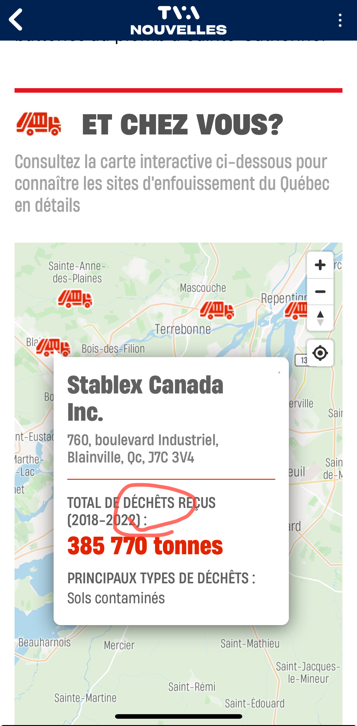 Dans l’article, dès qu’on clique sur une des icônes en forme de camion rouge, une fenêtre s’ouvre et le mot « Déchets » est transcrit avec un accent circonflexe sur le deuxième e.
