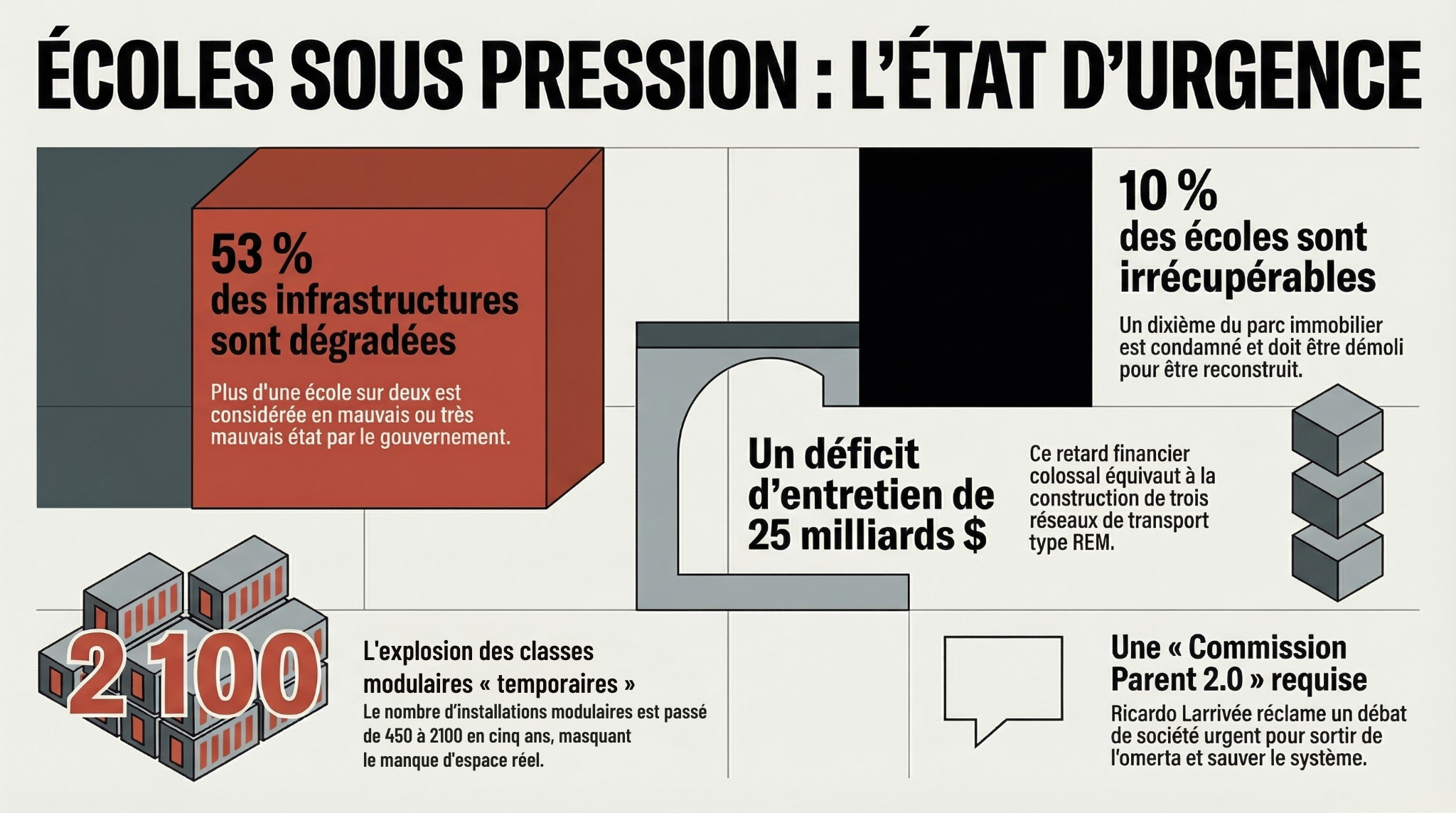 Cette prise de parole faisait écho à son reportage Écoles sous pression, qui sera diffusé le lundi 30 mars sur ICI Télé et Tou.tv. Et c’est peut-être cela, au fond, le plus troublant. Pas seulement l’état des bâtiments, mais la façon dont on a fini par banaliser la chose. Des plafonds qui coulent, des murs fatigués, des systèmes de ventilation déficients, des modulaires qu’on installe pour durer quelques années et qui finissent par s’éterniser. On ne parle pas ici d’un détail technique ni d’un simple enjeu d’entretien. On parle des lieux où des enfants passent une bonne partie de leur vie. On parle aussi des lieux où des adultes essaient, chaque jour, d’enseigner, d’accompagner, de tenir debout quelque chose d’essentiel.